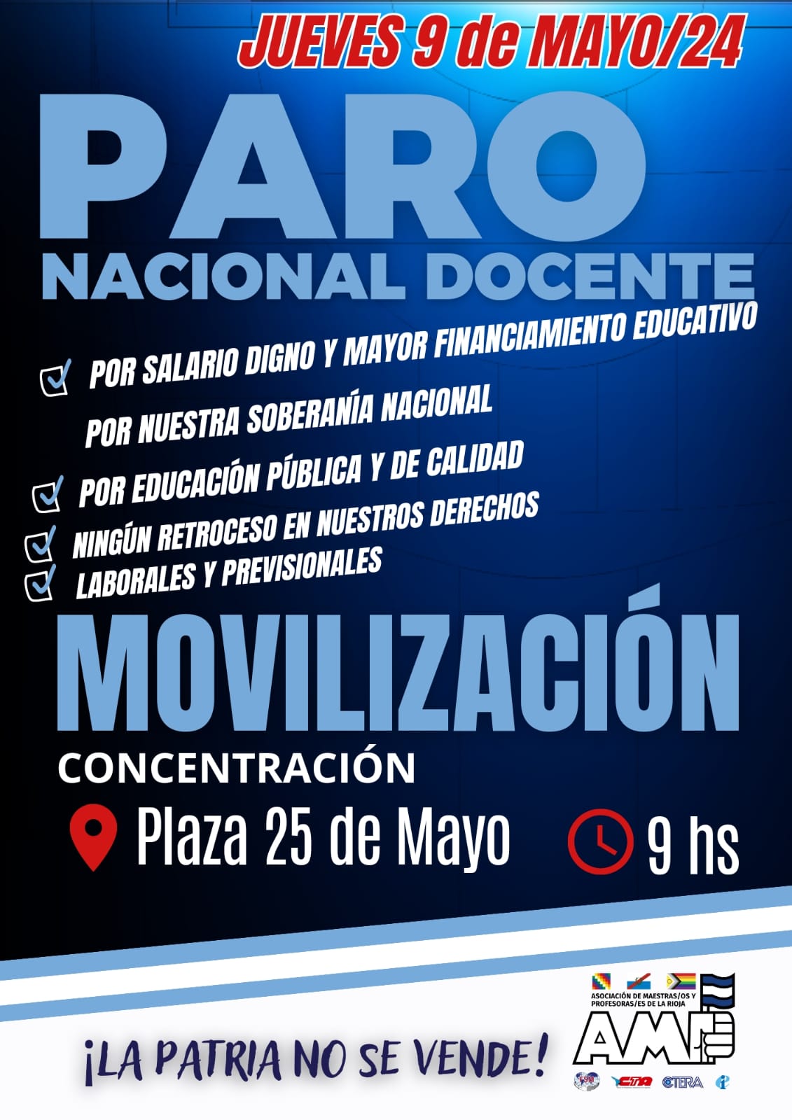 La Asociación de Maestras/os y Profesoras/es ratifica su adhesión al *PARO NACIONAL* convocado por la Central de Trabajadores de la Educación de la República Argentina, CTERA, para el jueves 9 de Mayo.