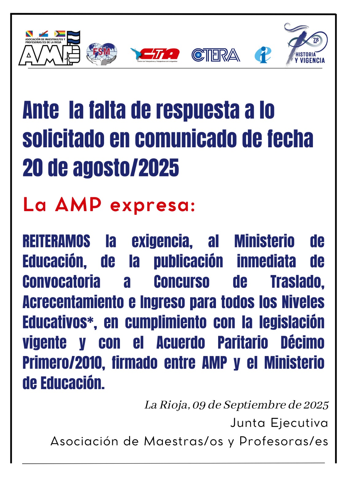 La Asociación de Maestros y Profesores de La Rioja, *reitera la exigencia, al Ministerio de Educación, de la publicación inmediata de Convocatoria a Concurso de Traslado, Acrecentamiento e Ingreso para todos los Niveles Educativos*, en cumplimiento con la legislación vigente y con el Acuerdo Paritario Décimo Primero/2010, firmado entre AMP y el Ministerio de Educación.