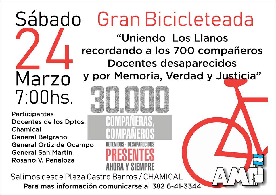Bicicleteada “Uniendo Los Llanos recordando a los 700 compañeros Docentes desaparecidos y por Memoria, Verdad y Justicia” Entre sus actividades del Ciclo Derechos Humanos y Pedagogía de la Memoria, la Delegación Chamical “Carlos de Dios Murias” de AMP, realizará una Bicicleteada “Uniendo los llanos por los 700 docentes desaparecidos del país y los 30 mil detenidos desaparecidos en la última dictadura militar Argentina: Por memoria, verdad y Justicia. CTERA- AMP. Será el sábado 24 de marzo partiendo de Chamical y culminado en Chepes. La actividad está prevista para el próximo sábado 24 de marzo, en el Día Nacional de la Memoria por la Verdad y la Justicia. El punto de partida será la ciudad de Chamical, a las 7 horas, con la bendición del Padre Carlos Baigorri y con llegada Chepes, atravesando las localidades de Olta y Catuna. Se iniciará en Chamical con los docentes del departamento que entregarán la posta a los compañeros de la Delegación del Departamento Olta; posteriormente se partirá al Departamento General Ocampo quien tomará la posta siguiendo camino hasta el Km. 14 en donde los compañeros del Departamento San Martín la tomaran para luego continuar hacia el departamento Rosario Vera Peñaloza, esta última posta también se llevará a cabo con la colaboración de los departamentos anteriormente mencionados. Son objetivos de la actividad: Revalorizar la Memoria, Verdad y Justica; Unir los Departamentos para mantener viva la Memoria, la Verdad y la Justicia; Recordar a los 700 compañeros Docentes desaparecidos; Mantener viva la memoria de Enrique Angelelli, Carlos Murias, Gabriel Longueville y Wenseslao Pedernera. Participan docentes y público en general, de los departamentos Chamical, Olta, General Ocampo, San Martín y Rosario V. Peñaloza. .