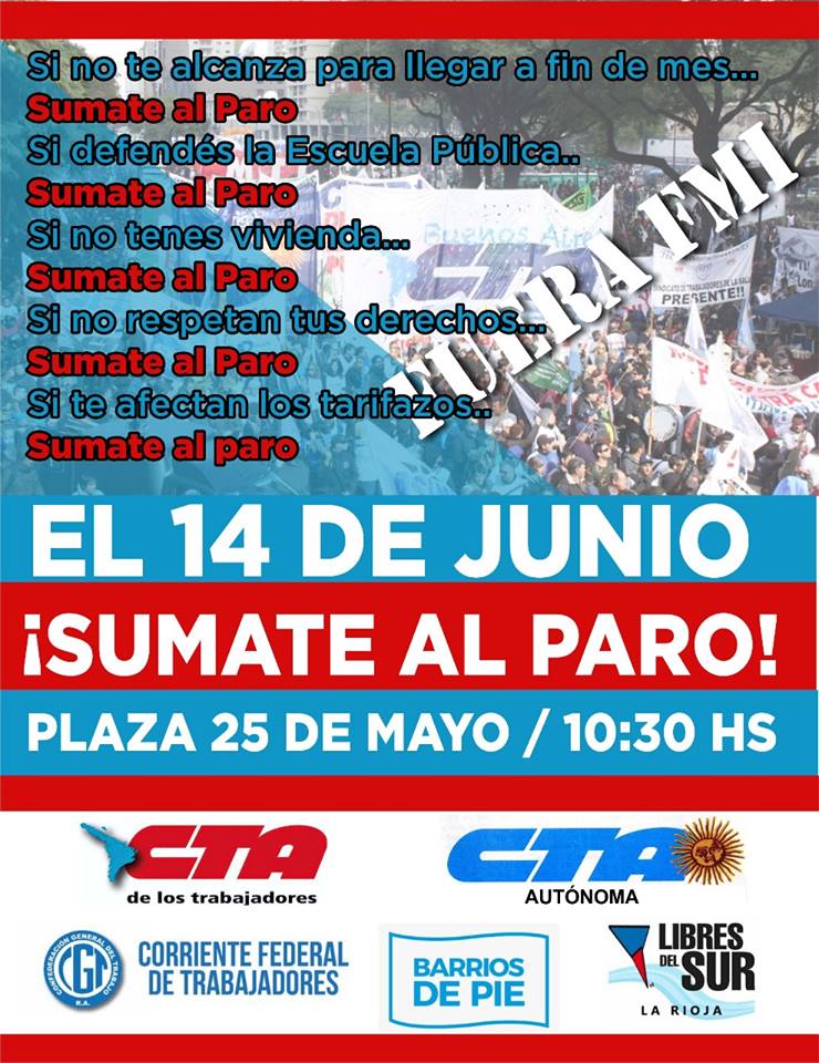 14 de Junio: Paro y Movilización en La Rioja La CTA de Trabajadores de La Rioja, la CTA Autónoma, la Corriente Federal de la CGT y movimientos Sociales de La Rioja, se reunieron este lunes en el gremio de AMP, para establecer acciones conjuntas para la jornada nacional de paro y movilización, el 14 de junio, convocada por ambas CTA, el sindicato de Camioneros y gremios de CGT. Será jornada de Paro de actividades; Radio Abierta y movilización en plaza 25 de mayo; Ollas Populares en distintos puntos de la Ciudad; entre otra medidas de reclamo . Los convocantes consideraron imprescindible ganar las calles para frenar los tarifazos, no volver al hambre y al empobrecimiento con las recetas del FMI y tener paritarias libres y sin techos impuestos por el Gobierno Nacional Los sindicatos convocan, para el día de mañana, 13 de junio, a una conferencia de Prensa en el SUM de AMP, a partir de las 11.30 horas para informar detalles de la modalidad del de paro y movilización | ||||