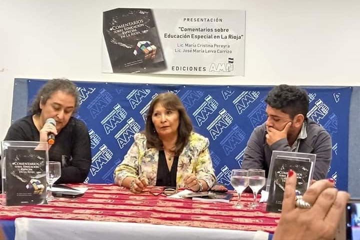 Presentación de libro: “Comentarios sobre Educación Especial en La Rioja” La Asociación de Maestros y Profesores (AMP), presentó el libro “Comentarios sobre Educación Especial en La Rioja” de los licenciados, María Cristina Pereyra y José María Leiva Carrizo. Se realizó el jueves 25 de Octubre, a las 20 horas, en el SUM de AMP. Ediciones AMP, puso al alcance de los docentes de La Rioja, material de consulta de profesores y profesionales que se desempeñan en escuelas especiales de la provincia y carreras universitarias afines. Según sus autores, éste libro no pretende ser un tratado o una investigación científica, solo una guía, pero al mismo tiempo una investigación para que los jóvenes profesionales que hoy se desempeñan en la educación especial, lo tomen como punto de partida perfectible al que ellos podrán darle una nueva mirada y con el correr del tiempo incorporar aportes. La obra presentada, sirvió convocó en el SUM del sindicato, a alumnos y docentes de educación especial de nuestra ciudad. La secretaria de Educación de AMP, Ingrid Mercado, presentó a los autores y destacó el aporte del gremio en el tema y puso en valor el libro en cuanto a argumentos y compilación de Normativa que reune. María Cristina Pereyra : Nació en Avellaneda provincia de Buenos Aires. Se recibió Profesora de Educación Primaria en el Colegio Nacional Domingo Faustino Sarmiento. Obtuvo el título de Profesora de Educación Preescolar en el Instituto de Formación Docente Bernardino de Rivadavia en El Palomar. Cursó el Profesorado de Lengua Francesa en el Profesorado Albino Sánchez Barros de La Rioja y la Licenciatura en Lengua Francesa en la Universidad Nacional de Catamarca y obtuvo el titulo de Profesora de Educación Especial Especializada en Sordos e Hipoacúsicos en el Profesorado Carolina Tobar García de La Rioja. José María Leiva Carrizo: Nació en la localidad de Tinogasta, Catamarca, Graduado en la licenciatura de Psicopedagogía. Se desenvuelve como psicólogo en el Jardín Privado Federadito de La Rioja; es docente de apoyo en la inclusión en el Instituto Interdisciplinario UNKAY. Actualmente es miembro del Consejo Directivo del Departamento Académico de Ciencias Humanas y de la Educación de la Universidad Nacional de La Rioja. | ||||