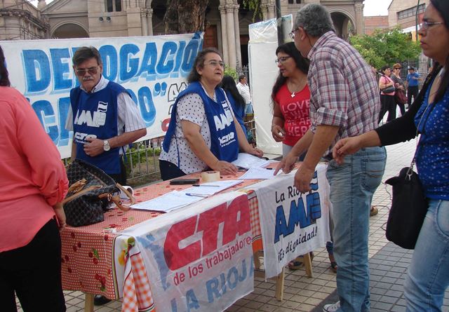 Movilización y Recolección de firmas en Plaza 25 de mayo Continuando con la recolección de firmas, para la presentación de un Proyecto de Ley de derogación del Decreto Nº 2255/88 (Cavero), la Asociación de Maestros y Profesores de La Rioja (AMP), reestableció la mesa en Plaza 25 de Mayo de nuestra Capital, coincidente con el Paro y Movilización de gremios de la CGT Triunvirato y Gremios de la Salud, por Aumento salarial y contra el Ajuste. En Aimogasta, también se recogieron firmas en la plaza principal de la ciudad. Superada la inestabilidad meteorológica de la semana próxima pasada, se retomó en el paseo principal de La Rioja, la recolección de firmas para la Derogación del “Dcto Cavero”. Los trabajadores firman sin compromiso y con entusiasmo, el reclamo por validar el derecho constitucional de huelga coartado por el decreto. Rogelio De Leonardi, secretario Gral. de AMP y de la CTA de los trabajadores, al ser consultado por los medios de prensa dijo: “En la plaza vamos a estar todos los días, vamos a insistir en coordinar movimientos con todos los sectores de trabajadores, para que podamos conyugar (…) Hoy nosotros estamos haciendo nuestro aporte, porque cuando el gobierno diga que va aplicar el “Dcto Cavero”, hace que toda la gente no pare o movilice por temor al descuento. Los millares de firmas que se están juntando en toda la provincia, se presentarán antes de la última sesión del año, de la Cámara de Diputado, para un Proyecto de Ley que derogue el decreto Cavero” Respecto a la situación salarial de los docentes, De Leonardi señaló que mañana jueves, el Ministerio de Educación de manera tardía, recién hará el ofrecimiento de recomposición salarial para el sector; paralelamente, se convocó para el próximo martes, a la Asamblea Provincial de Delegados Escolares que tomará decisiones sobre la propuesta recibida. “Si el aumento fuese cercano al 20%, estaríamos rozando la inflación del mes de septiembre, no el mes de octubre, nos quedamos cortos (…) la negociación que hagamos ahora debe ser parecidos al 50% que va tener el país en diciembre... Hablar de 8%, no satisface de ninguna manera. Esta movilización que sirva de seria alerta al gobierno provincial, pero también al gobierno nacional”, concluyó. | ||||