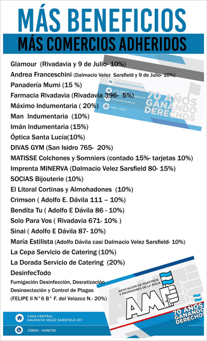 DESINFECTODO https://www.cylex.com.ar/la+rioja/desinfectodo-11205550.html FARMACIA RIVADAVIA https://www.facebook.com/fcia.rivadavia/ GAMMA LABORATORIO DE ANALISIS CLÍNICOS https://www.facebook.com/labogamma/ ANDREA FRANCECHINII https://www.facebook.com/FranceschiniLaRioja/ OPTICA SANTA LUCÍA https://www.facebook.com/laopticadelarioja/ MAN INDUMENTARIA https://www.facebook.com/ManIndumentaria/ IMAN INDUMENTARIA https://www.facebook.com/ImanRopaInformal/ | ||||