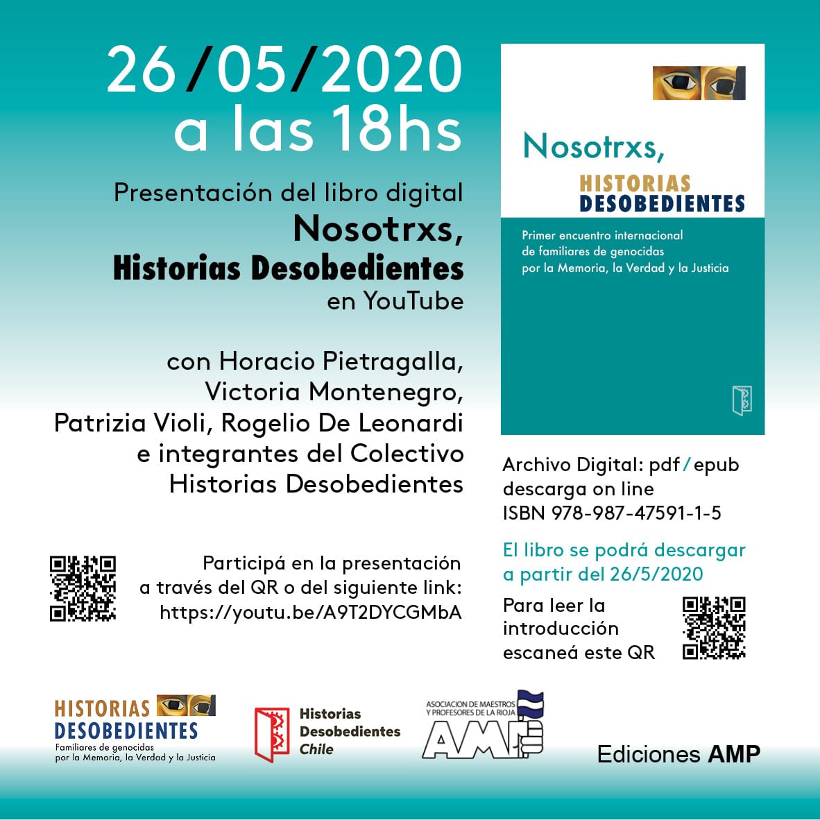 AMP presenta libro junto al colectivo Historias Desobedientes Este martes 26 de mayo a las 18 horas se hará la presentación virtual del libro "Nosotrxs, Historias Desobedientes" que recopila las intervenciones y debates del Primer Encuentro Internacional de Familiares de genocidas por Memoria, Verdad y Justicia. En la presentación participarán Horacio Pietragalla (Secretario de Derechos Humanos de la Nación), Victoria Montenegro (Legisladora de la CABA), Rogelio De Leonardi (Secretario General de AMP y Secretario de Derechos Humanos de CTERA), Patrizia Violi (semióloga Universidad de Bologna), e integrantes del colectivo Historias Desobedientes. La presentación de la obra editada por la Asociación de Maestros y Profesores de La Rioja, se hará en el canal de difusión de YouTube: https://youtu.be/A9T2DYCGMbA