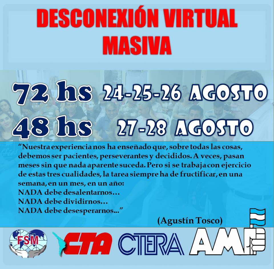 En la misma y como parte de un conjunto de resoluciones más amplio, RATIFICÓ la medida resuelta en Asamblea anterior, por 48 horas para jueves 27 y viernes 28 del corriente mes. Sumado a ello dispuso una nueva DESCONEXIÓN VIRTUAL MASIVA por 120 horas, desde el lunes 31 de agosto, hasta el viernes 4 de septiembre, inclusive. En el mismo paquete de resoluciones, la AMP expresa su solidaridad con las/es Trabajadoras/es de la Salud, toda vez que considera a éste como un servicio primordial, que debe formar parte de las prioridades de las/os gobernantes provinciales, por lo cual solicita una mayor inversión en el sistema sanitario, para evitar consecuencias nefastas en nuestra comunidad.