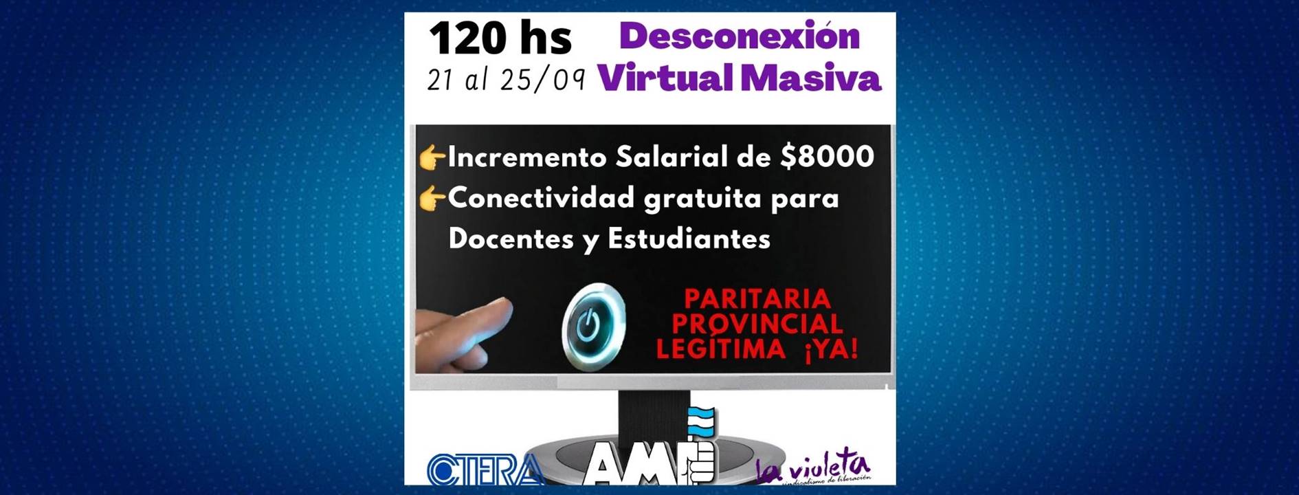 Continuamos exigiendo PARITARIA LEGÍTIMA YA! La Asociación de Maestros/as y Profesores/as de La Rioja sesionó en el 2do Cuarto Intermedio de la 218° Asamblea Provincial Extraordinaria de Delegados/as Escolares. En la misma resolvieron una nueva DESCONEXIÓN VIRTUAL MASIVA de 120 hs dispuestas para la presente semana. *DESCONEXIÓN VIRTUAL MASIVA* por 120 hs para el lunes 21, martes 22, miércoles 23, jueves 24 y viernes 25 de septiembre *👉Por Paritaria Provincial Legítima ¡Ya!* *👉Por Incremento Salarial de $8000* *👉Por conectividad gratuita para Docentes y Estudiantes* *#AMPesDignidad* 🇦🇷 *#73AñosDeTrayectoriaCombativa*💪🏼 *#QuédateEnCasa*🏡🌈 La Rioja, 21.08.20 *Comunicado Oficial de la AMP* | ||||