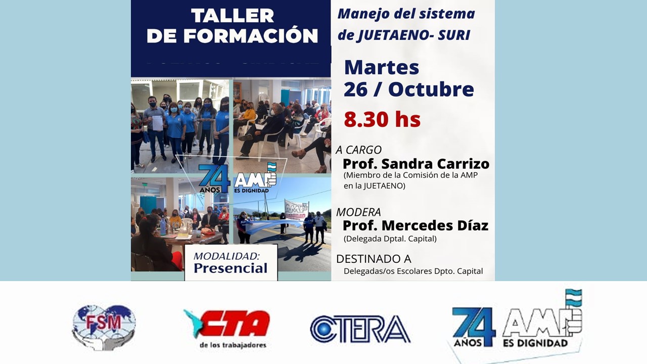 La Asociación de Maestras/os y Profesoras/es, invita a sus Delegadas/os Escolares - Capital, a participar del Taller: Manejo del Sistema SURI - JUETAENO (Inscripción y Agregado de Antecedentes Docentes).