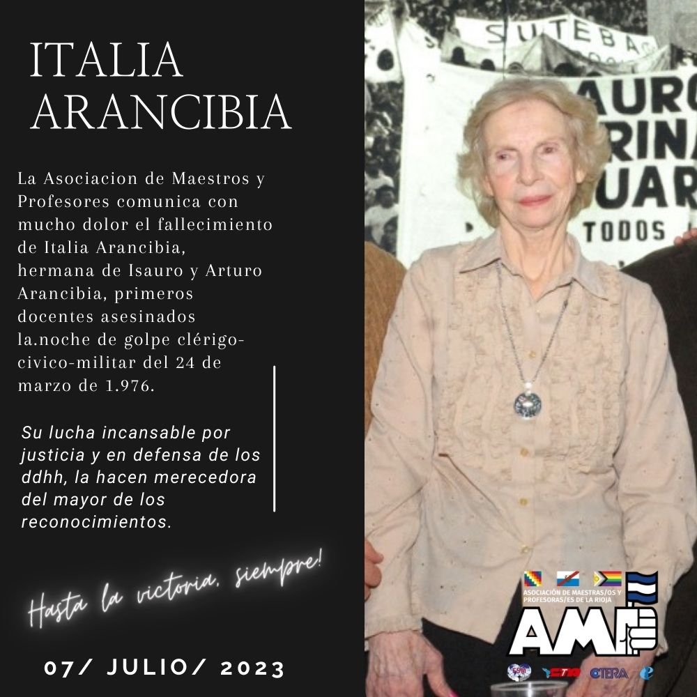 La AMP expresa su dolor por el fallecimiento de Italia Arancibia, hermana de Isauro y Arturo, compañeros asesinados por la dictadura genocida el 24 de marzo de 1976. Isauro fue fundador de CTERA y era secretario general de la Agremiación Tucumana de Educadores Provinciales. | ||||