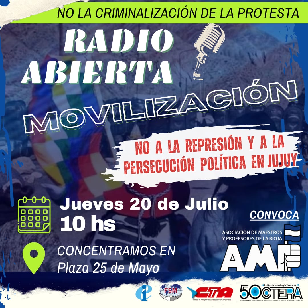 La Asociación de Maestros y Profesores de la Rioja manifiesta su *ENÉRGICO REPUDIO EN CONTRA DE LA REPRESIÓN Y LA PERSECUCION POLÍTICA* de la que son objeto las compañeras y los compañeros jujeñxs. Las prácticas que lleva adelante Morales, en la provincia de JUJUY, toman mayor relevancia cuando este nefasto personaje pretende ser el próximo Vice- Presidentes de todas y todos los argentinos. Acciones como las que son de pùblico conocimiento nos llevan a recordar momentos repudiables de la historia argentina, donde se vulneraron derechos conquistados a través de la historia y que están reflejados en la Constitución Argentina, carta magna de nuestra Nación. El pueblo soberano esta siendo atacado, reprimido, vulnerado en nombre de intereses particulares y mezquinos, contra ello lucharemos. *La AMP convoca a RADIO ABIERTA a realizarse este jueves 20 de julio a las 10 hs en la Palaza 25 de Mayo, para que NUNA MÁS!* *#AMPesDignidad🇦🇷* *#MasDe75AñosEnClaveDeUnidad💪🏼* *#EnDefensaDeLaEscuelaPública* La Rioja, 18.07.23 *Comunicado Oficial de la AMP*