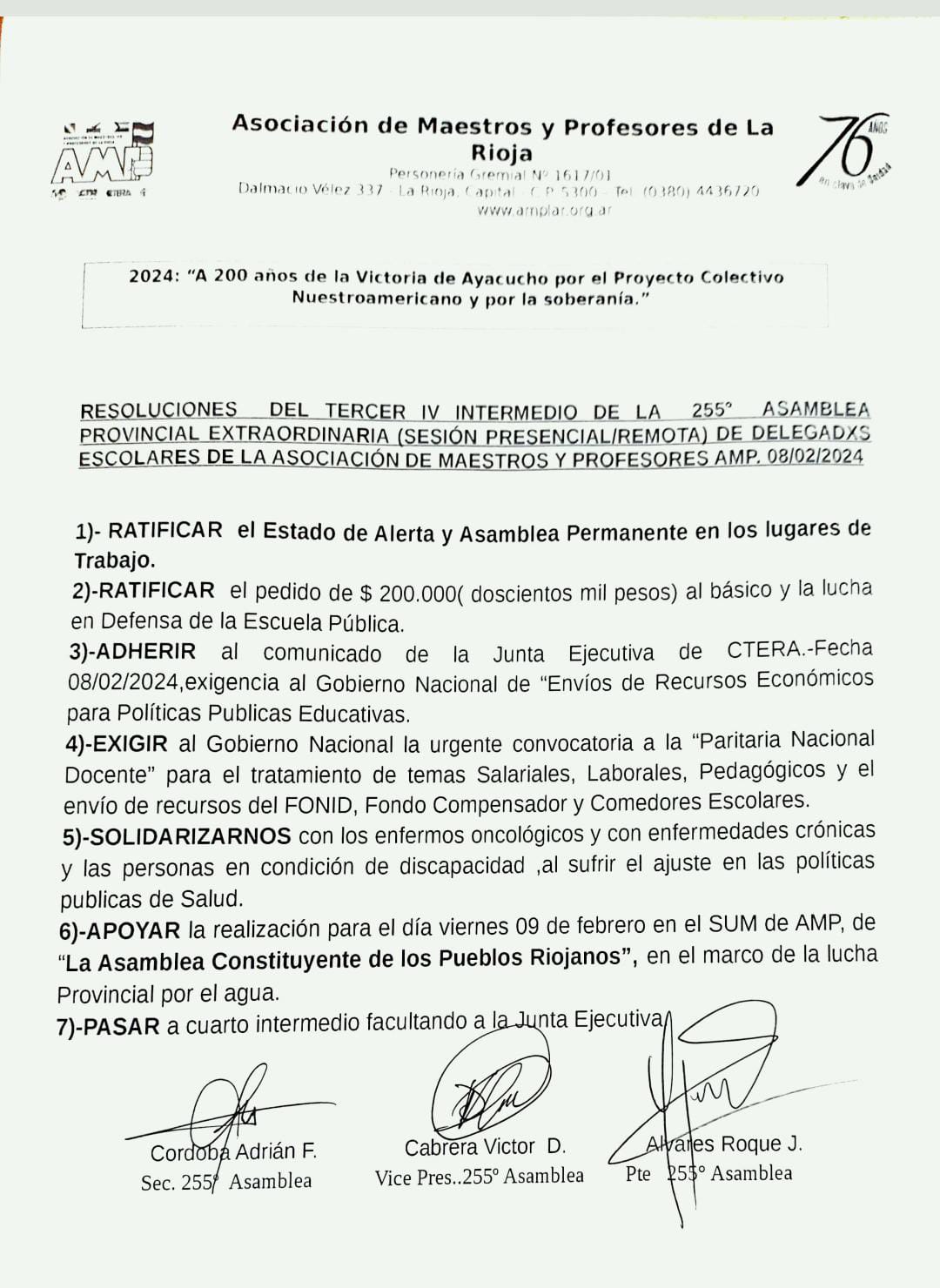 2)- *RATIFICAR* el pedido de los $ 200 (doscientos mil pesos) al básico y la lucha en Defensa de la Escuela Pública.