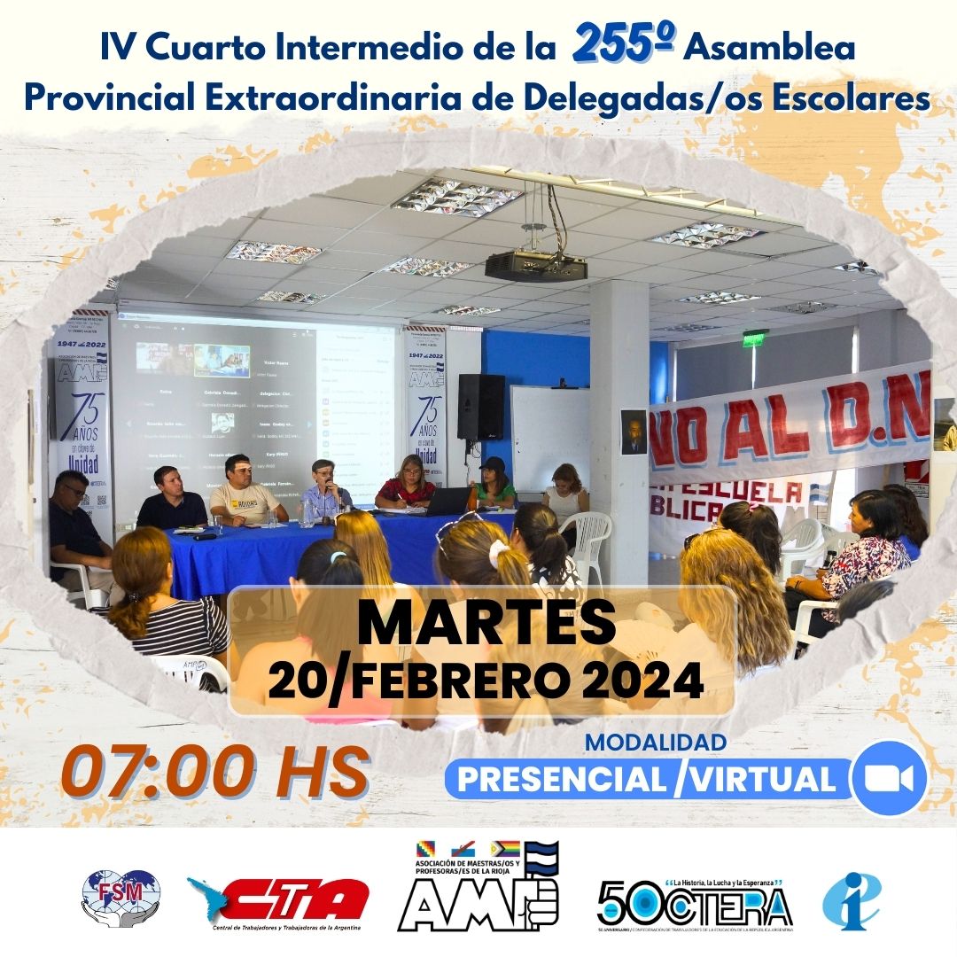 La Junta Ejecutiva de la Asociación De Maestros y Profesores de La Rioja (A.M.P.), convoca al *IV Cuarto Intermedio de la 255° Asamblea Provincial de Delegadas/os Escolares (SESIÓN PRESENCIAL/REMOTA),* para el día *Martes 20 de FEBRERO 2024, a horas 07,* con dos horas de tolerancia (iniciamos a las 09) en el SUM-AMP, ubicado en calle Dalmacio Vélez Sarsfield N°337, ciudad de La Rioja.