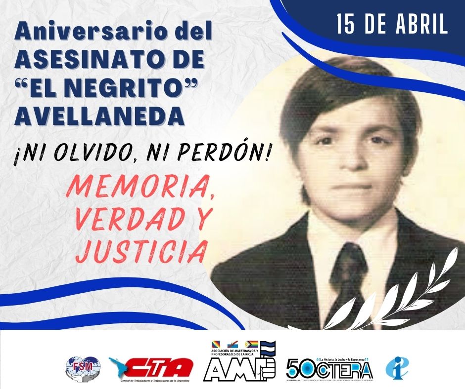 La noche del 15 de abril de 1976, la dictadura militar secuestró y desapareció al “Negrito” Floreal Avellaneda. Floreal “El Negrito” Avellaneda nació en un hogar de trabajadores con compromiso social. Al tiempo del golpe de Estado de 1976 Floreal padre trabajaba en Tensa, una fábrica metalúrgica del norte bonaerense, y había sido elegido delegado junto a otros compañeros del P.C. y de la Juventud Peronista. En la madrugada del 15 de abril de 1976 una banda del Ejército asaltó el hogar de los Avellaneda en busca del dirigente, que alcanzó a escapar por los techos. Los uniformados se llevaron a su mujer, Iris Pereyra, y a su hijo Floreal “El Negrito” a la comisaría de Villa Martelli, donde fueron sometidos a brutales torturas. Fue la última vez que Iris, su mamá, vio a su hijo.