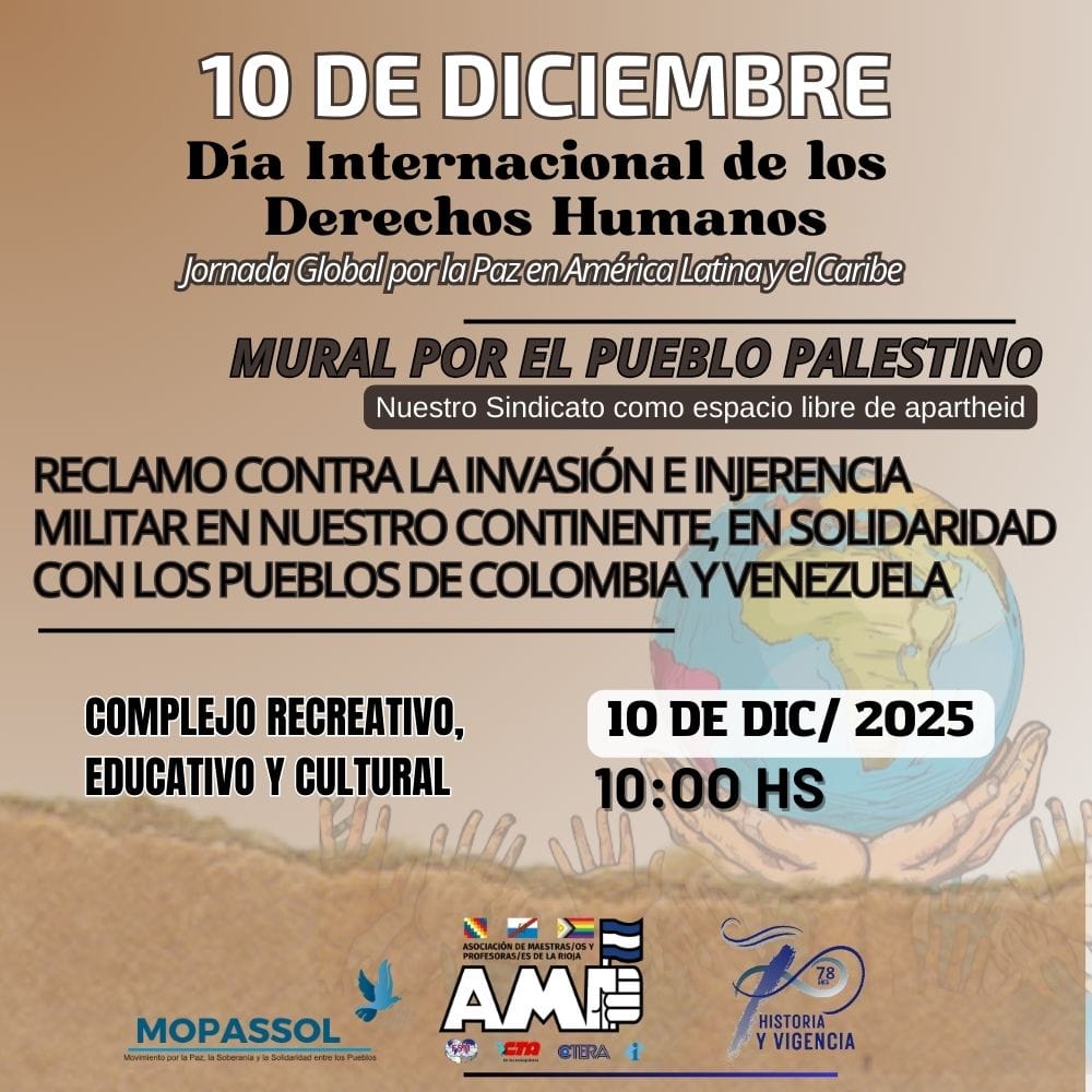 Desde AMP entendemos que la escuela es un territorio de paz y de construcción de soberanÃa, en todos sus aspectos. Por esto, reclamamos la soberanÃa de nuestros recursos hÃdricos y, consiguientemente, la expulsión de la empresa israelà Mekorot de La Rioja: *_el agua no se toca_*.